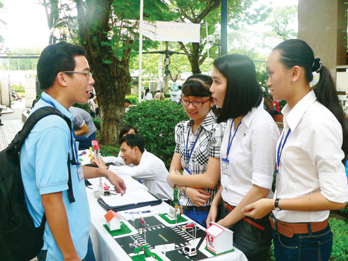Thay đổi cho xe buýt Lâu nay, việc các xe buýt dừng xe, tấp bến đột ngột luôn khiến người đi đường hoảng hốt dẫn đến không ít trường hợp tai nạn. Theo Tạ Thu Thủy, sinh viên (SV) ngành khoa học máy tính Trường ĐH Công nghệ thông tin TP.HCM, một nguyên nhân quan trọng dẫn đến tình trạng này là tài xế không nghe thông báo xuống trạm, hoặc nghe nhưng quá đột ngột, buộc phải cho xe dừng gấp để khách xuống đúng điểm mình mong muốn. Từ đó, Thủy đưa ra ý tưởng cải tiến hệ thống chuông báo trên xe buýt, bằng cách thiết lập hệ thống bảng thông báo các trạm mà tuyến xe buýt được phép dừng và bàn phím nhập số kèm theo. Người trên xe sẽ lựa chọn số thứ tự của trạm mà mình muốn xuống và trạm này sẽ có tín hiệu màu vàng. Bên cạnh đó, đèn đỏ trên bảng thông báo cho biết xe buýt đang đi đến nơi nào, gần đến trạm sẽ có loa thông báo. Vì vậy hành khách có thể dễ dàng theo dõi hành trình của xe để biết xuống trạm đúng nơi, đúng lúc.