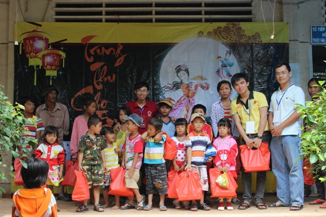 Ngày 15/9/2013 vừa qua, CLB Thiện Tâm đã tổ chức thành công chương trình Trung Thu Cho Em 2013 tại xã nghèo Tân Thành, huyện Thủ Thừa, Long An. Tại đây, CLB đã trao tặng 51 phần quà gồm bánh trung thu, tập vở, bút, sữa, đèn lồng... cho 51 em có hoàn cảnh đặc biệt khó khăn và bánh kẹo tổng hợp cho gần 100 em có mặt tại chương trình. Ảnh: Các bé vui chơi nhận quà